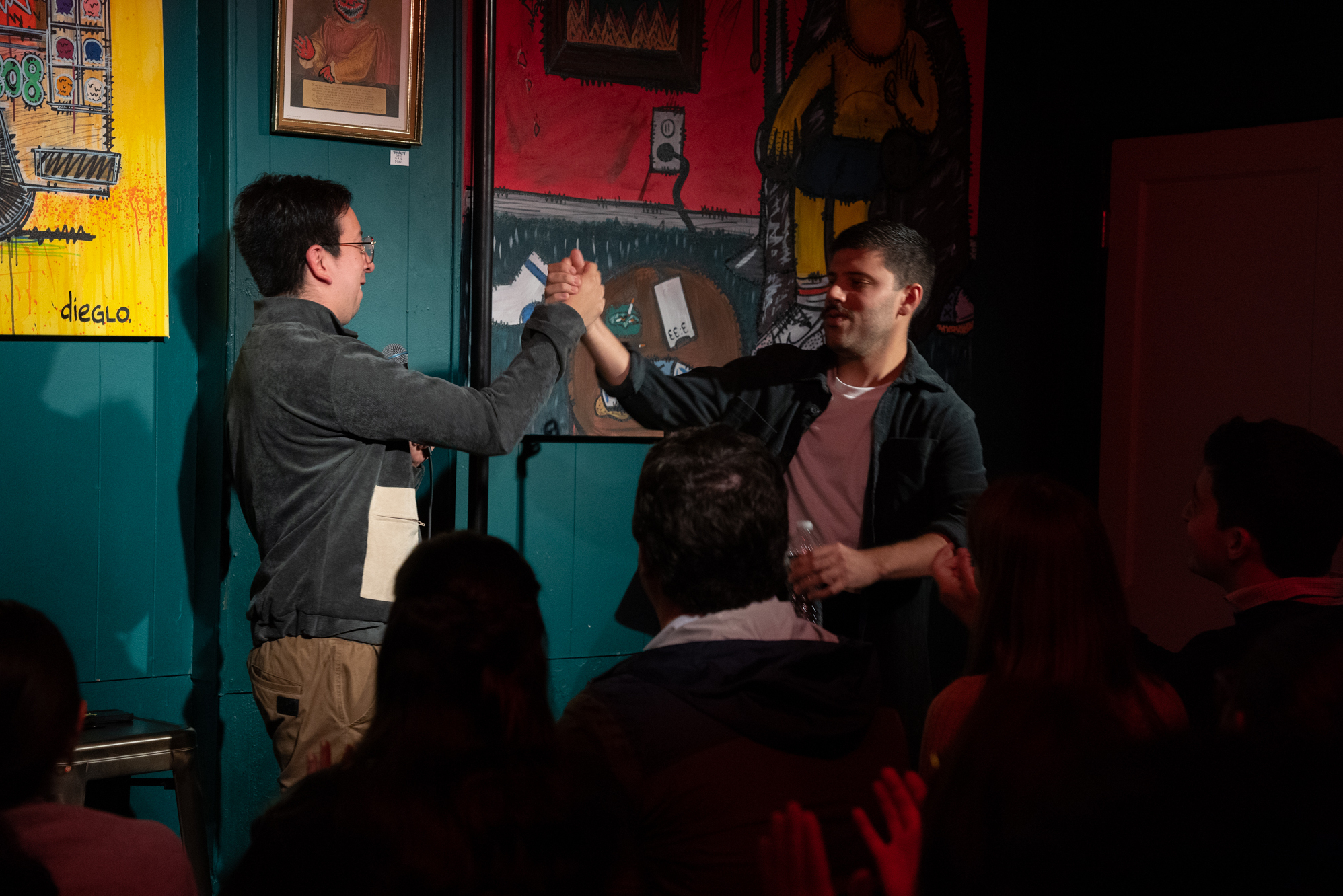 Fellow performer Daniel Castañeda, left, welcomes Colina to the stage.